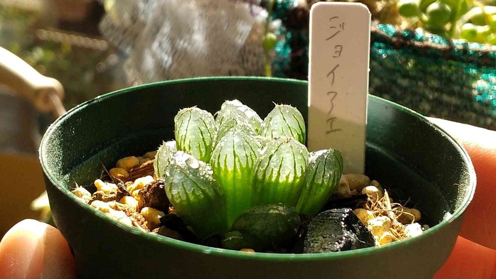 そう言ってくださると助かります。手に入れたとき付いてきた札にはジョイアエと書いてあったので勝手に変えられないのですが、どうにも見た感じ違うよなぁって。でも水を含むと本当に窓がきれいな子です。