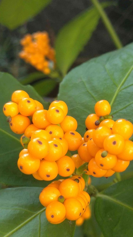 黄色の千両の実も、次第に鮮やかなオレンジに変わりつつあります。