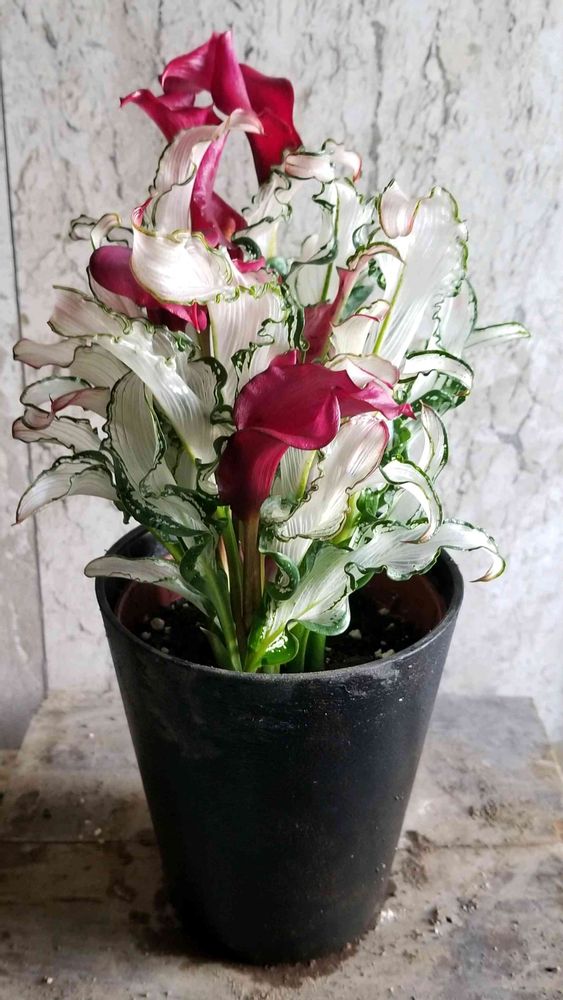 カラーとは相性悪いってわかっていたけど引き寄せられてお連れしてしまった「氷の女王」様は、透き通るような白班入りの葉とワインレッドのコントラストがステキすぎる~😍😍