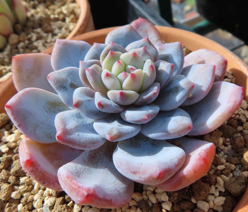 秋になって成長したのか,成長点付近の明るい緑とくっきりした赤い爪を持つ葉に対して,外側は青みを帯びた葉に粉が雪のように積もって,まるで二つのエケベリアが合体したような姿になった。