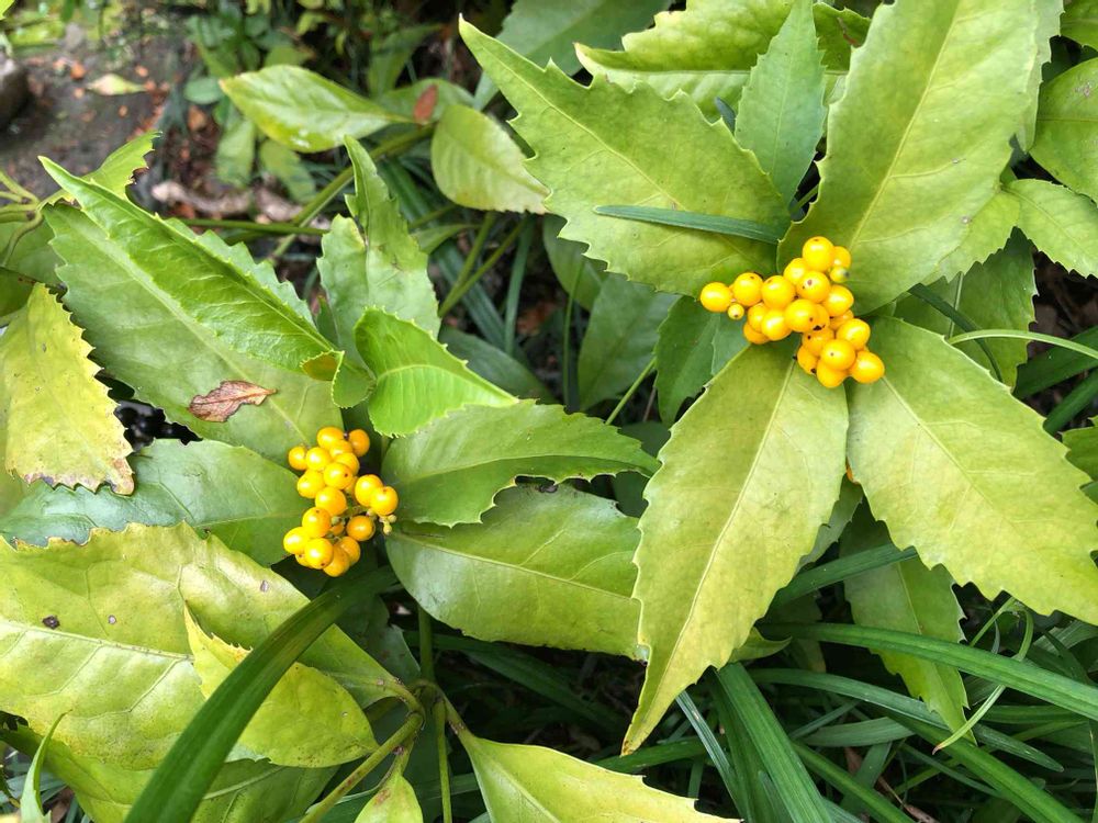 京都の家の庭で黄色のセンリョウを見つけましたよ。