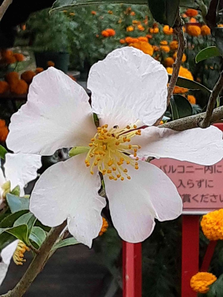 オレンジのマリーゴールドのお花が白い椿の可愛さを引き立たせてくれてますネェ🎶