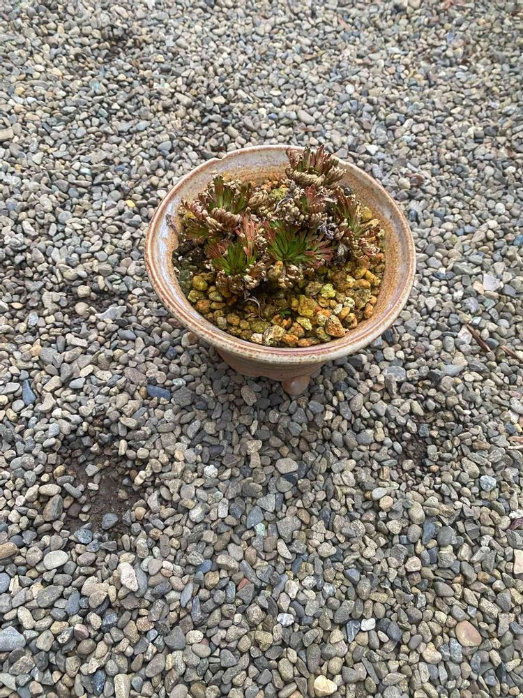 野州花石菖の鉢がひっくり返され、ピンチの色丹草は土を掘り返され、あろうことかハニワ君はノックアウトされていました(怒💢)