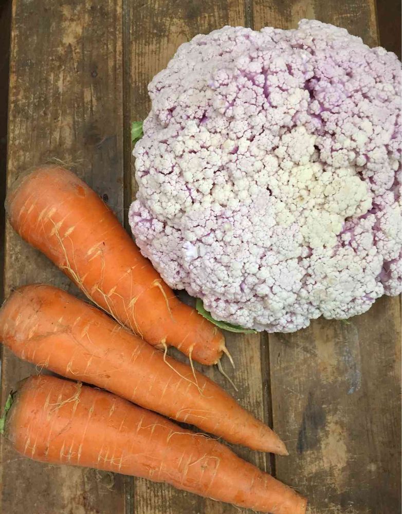 油断してたらカリフラワーが大きくなり過ぎました! 白い品種なのに夜温の低下でアントシアニン着色するし・・まあ茹でれば問題ないですが😅 いっぱいカリフラワーが収穫できるので、畑友に上げたら、お礼にニンジン貰いました🥕 ありがたや🙏