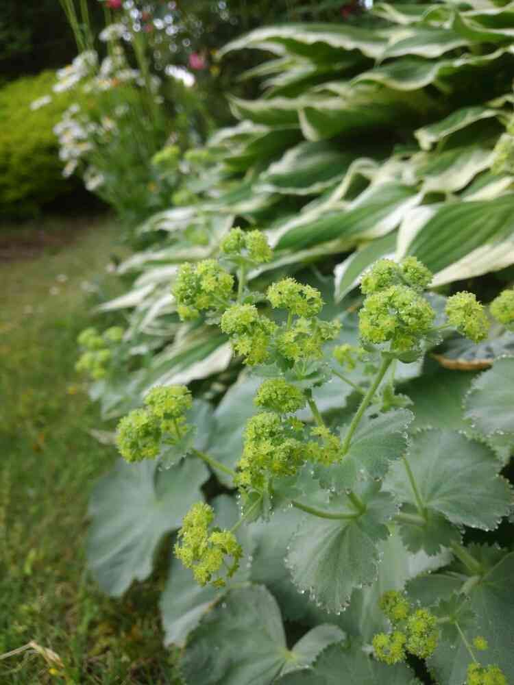 朝露に濡れたアルケミラモリスと巨大化したギボウシ🌿