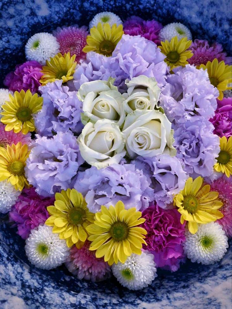 薄紫のトルコ桔梗が白バラを囲み、美しい花手水です💙🤍💜