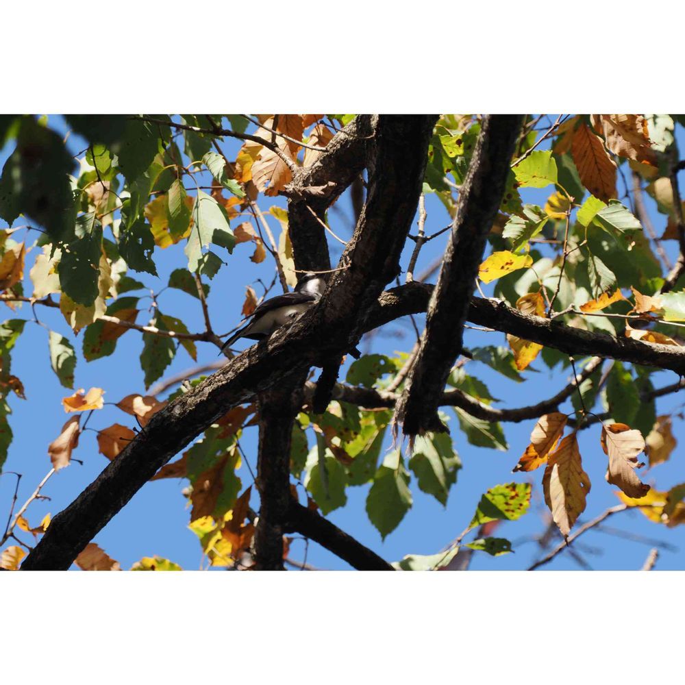 やっと見つけたリュウキュウサンショウクイらしき鳥さんでしたが、枝の陰の上に後ろ向きでコチラを向いてくれず、やっと向いてくれたのがこれですからイヤハヤ何とも...