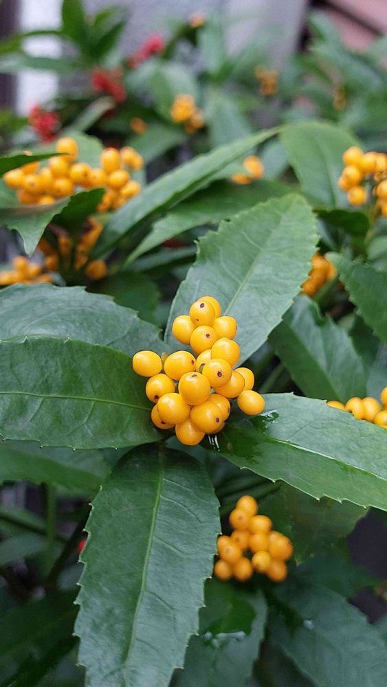 近所に赤と黄色のセンリョウを