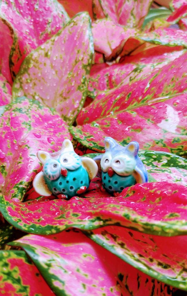 鮮やかな葉っぱに、負けないくらいのカラフルなカワイイ🦉🦉がチョコンと2つ〜九谷焼なんや〜素敵なコラボ〜💕💕💙💙💕💕😍