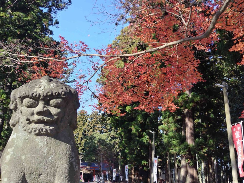 狛犬越しのイロハモミジの紅葉🍁