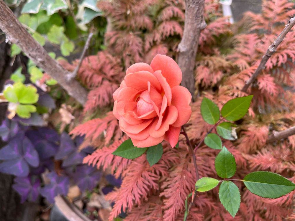 シダがあちこち生えて自然に寄せ植えになってます😂紅葉がきれいです✨バラと同じ色で〜す😆💕