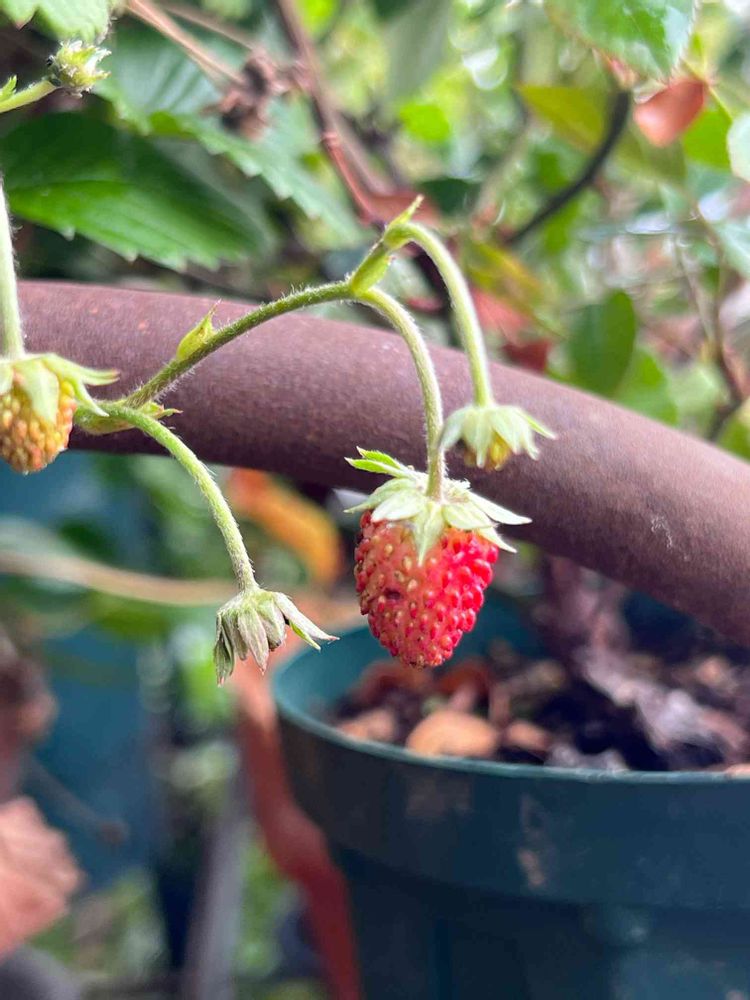 花が咲いて小さな🍓ベリーを付けています。まだ、味見してません、そろそろかしら😅