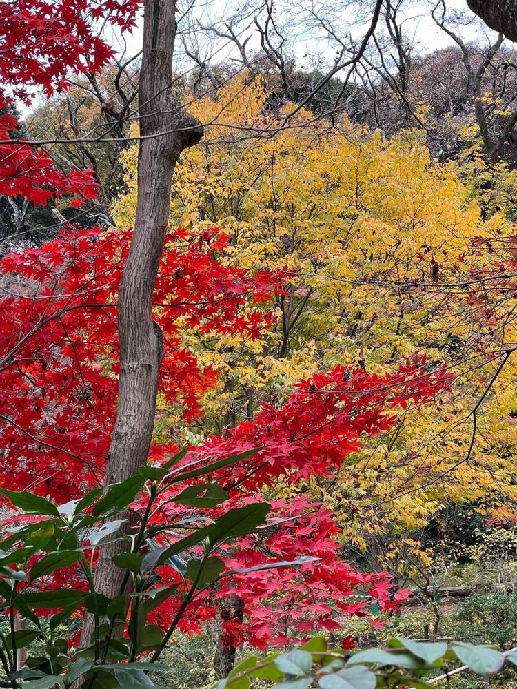 赤と黄のコントラストに圧倒されました。枯葉が雪のように降り注ぎ、ピークは過ぎたようです。