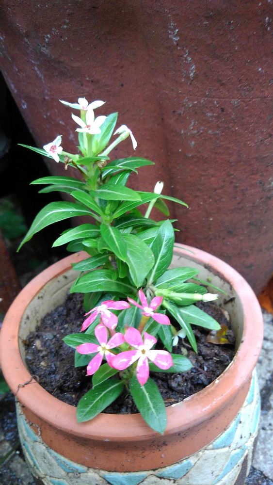 紅白の日日草 ミニナツ。挿し芽で作った小さな鉢の寄せ植え。いつまで咲くのかな?窓辺に移動すればかなりもつかな?