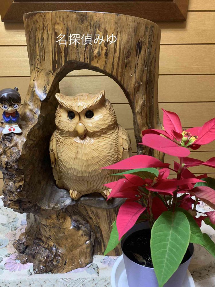 木彫りのフクロウさん、素晴らしいです✨ コナン君が小さく見えて、可愛い💕