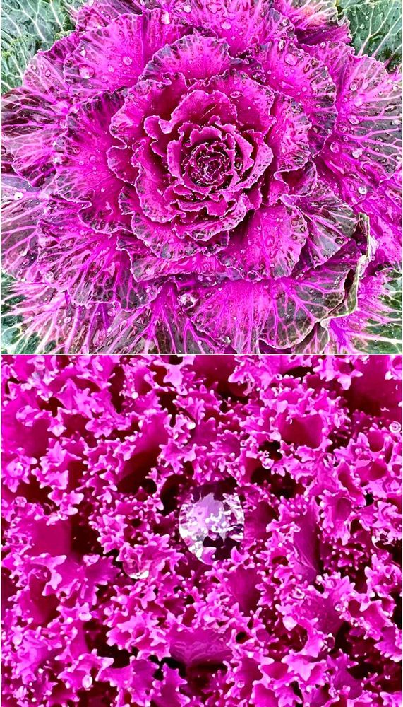 葉牡丹の雨粒が宝石を散りばめたようで素敵です✨