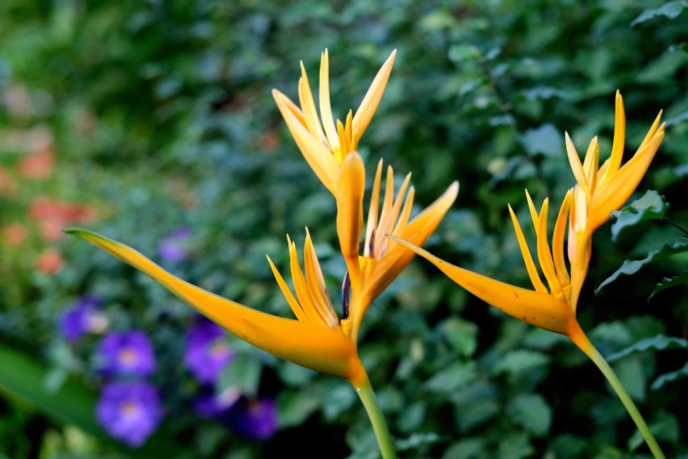 いつも元気なヘリコニアの向こうの紫はツンベルギア、そのまた向こうの赤はサンタンカかな。よく見る馴染みの花々です。
