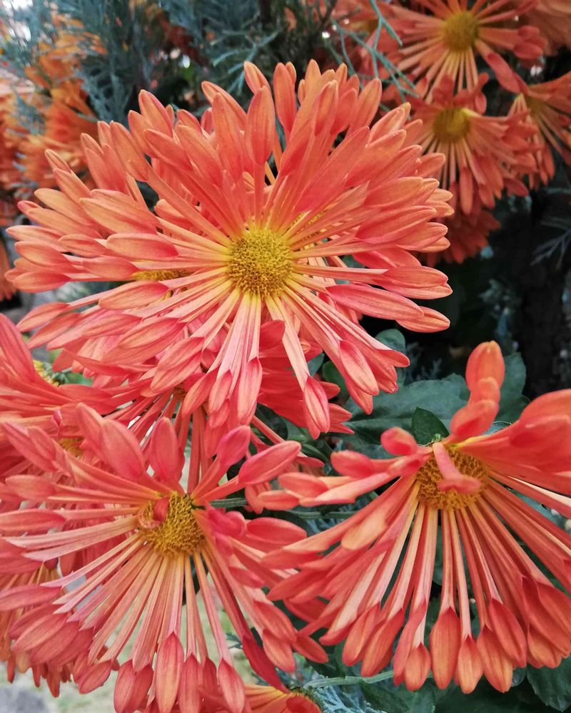 ホムセン屋外園芸コーナーに植えられていたキクのスプーン状花弁のオレンジ色の花 2022-11-26