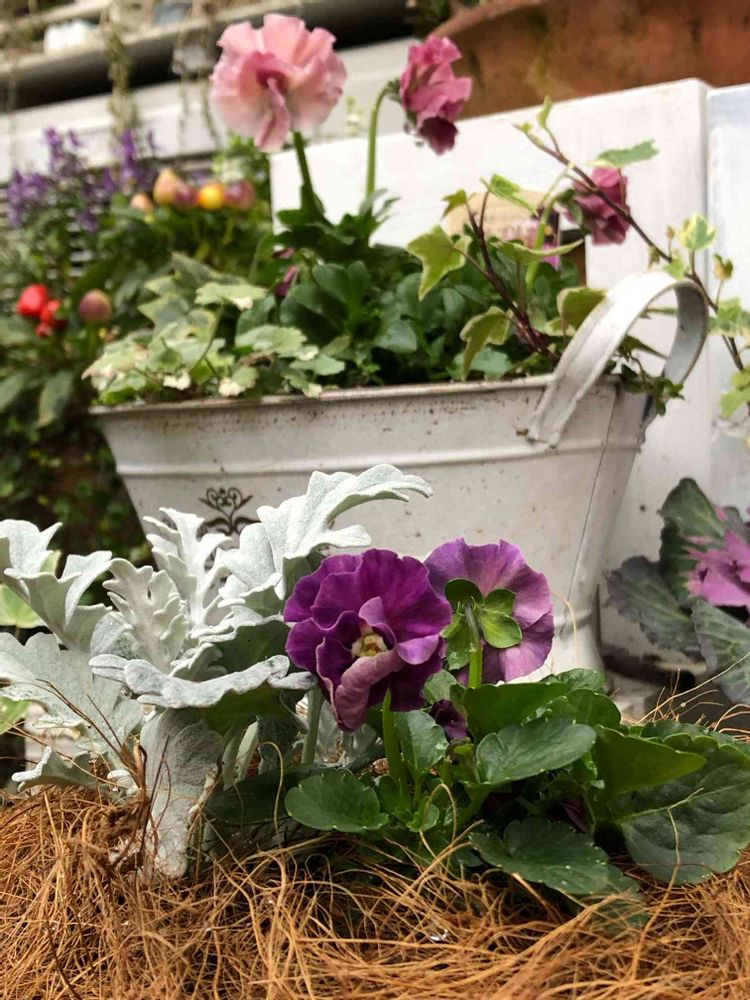 玄関前のピンクのシエルブリエ💗と、紫の夢見るパンジー💜 可愛いなぁ♡