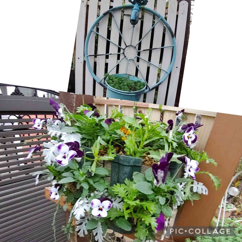 表側、裏側にはペンキを塗らないので挿し芽で作った寄せ植えで隠しました。