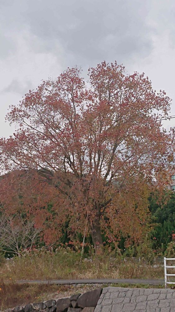 一部は枯葉。川べりの大きな木です。下には色とりどりの落ち葉がありました。