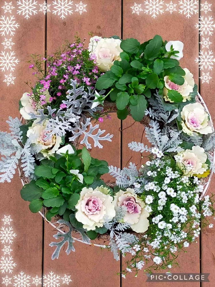葉牡丹、カスミソウ、ビオラなどで寄植えリース作りました💝