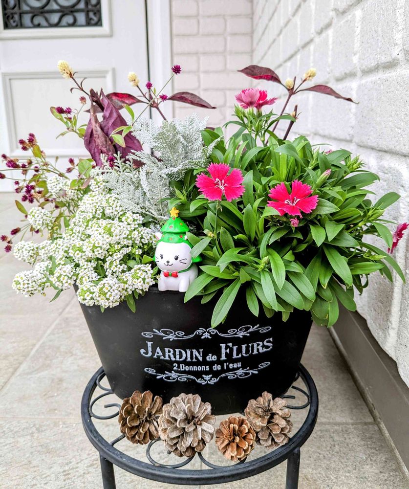 クリスマスグッズで猫ちゃんは珍しい!と思ってすぐ買って、今日から寄せ植えに乗ってもらいました😸