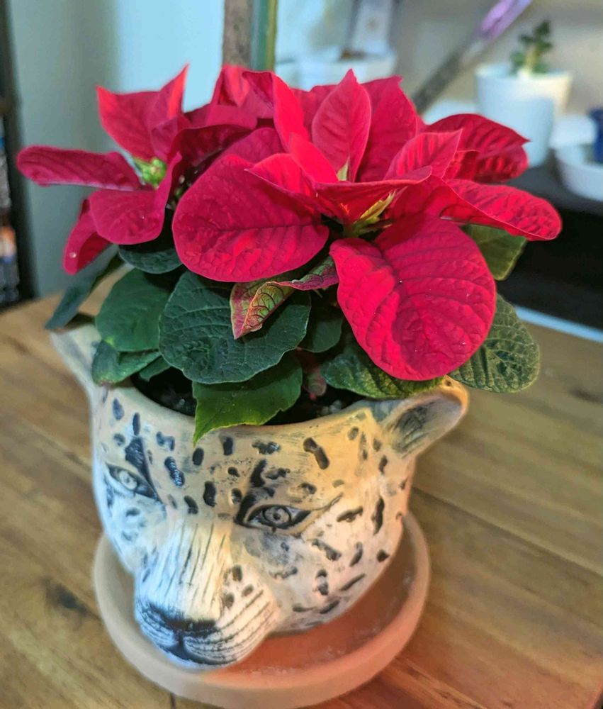 チータの鉢に入ったポインセチアさん❤️💚よく合ってますね