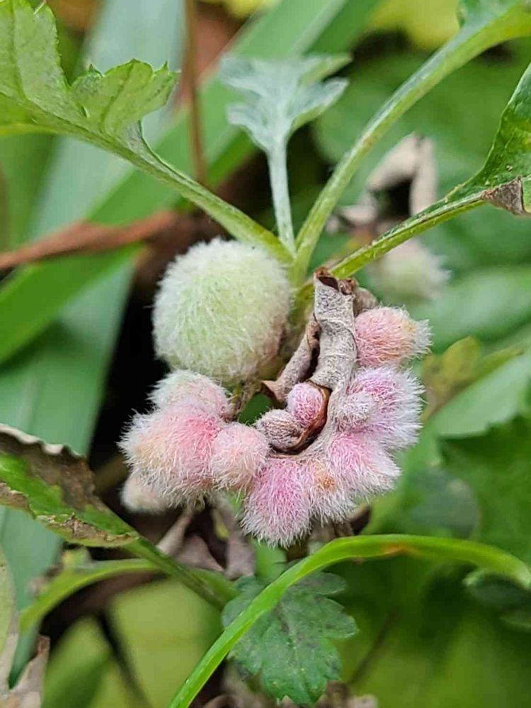 ヨモギシロケフシタマバエによって、ヨモギの葉の上に作られる虫こぶだそうです。