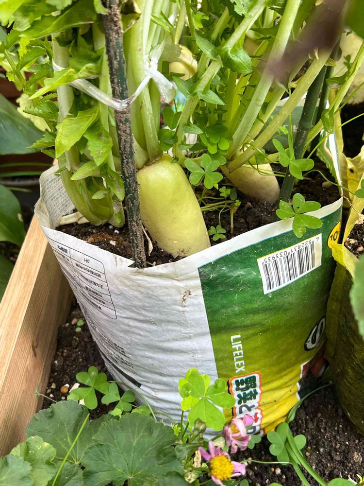 我が家では、初めてナイロン袋を使って大根を育ててみました