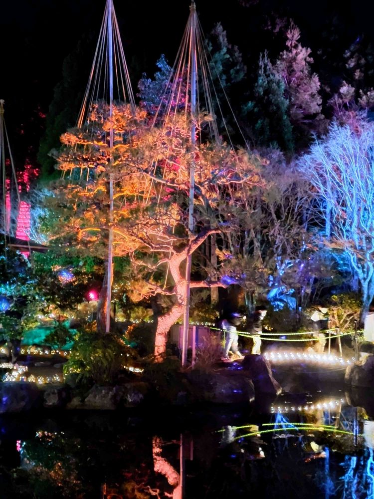 先日 日曜日に行ったのですが モミジの葉がかなり散っていたので それが残念でしたが 多色のライトアップで幻想的でした💕