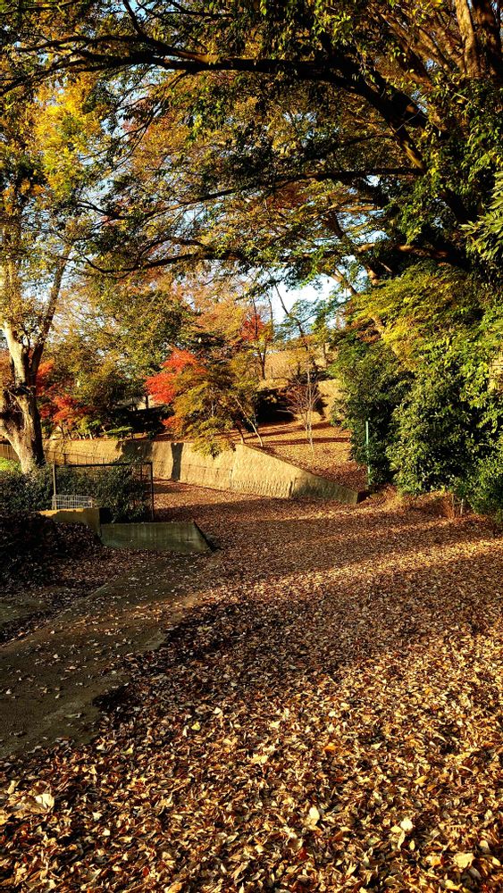 西日が差し込む落ち葉で敷きつめられた遊歩道🍁🍁🍁 未踏の新雪の上を歩くときのように、サクッサクッと気持ちのよい音がしました😀(近所の農業試験場内の遊歩道にて)