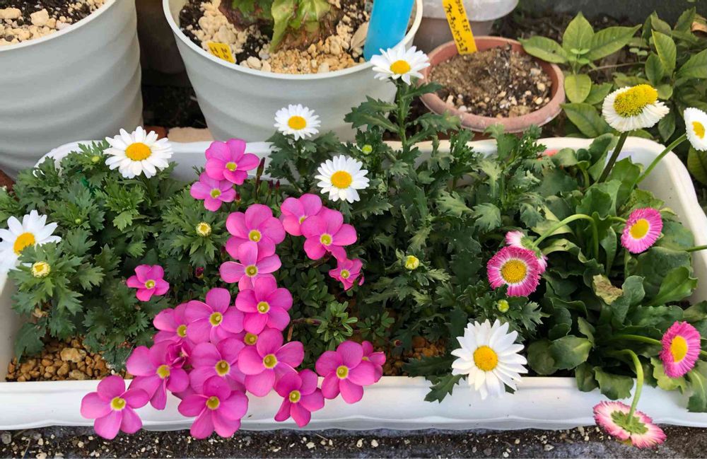 先日お迎えした、左からクリサンセマム ノースポール(白)、オキザリス(ピンク)、デージー(白、ピンク)丈夫で育てやすそうな種類(人・_・)💕初心者には有難いです😍💕💕