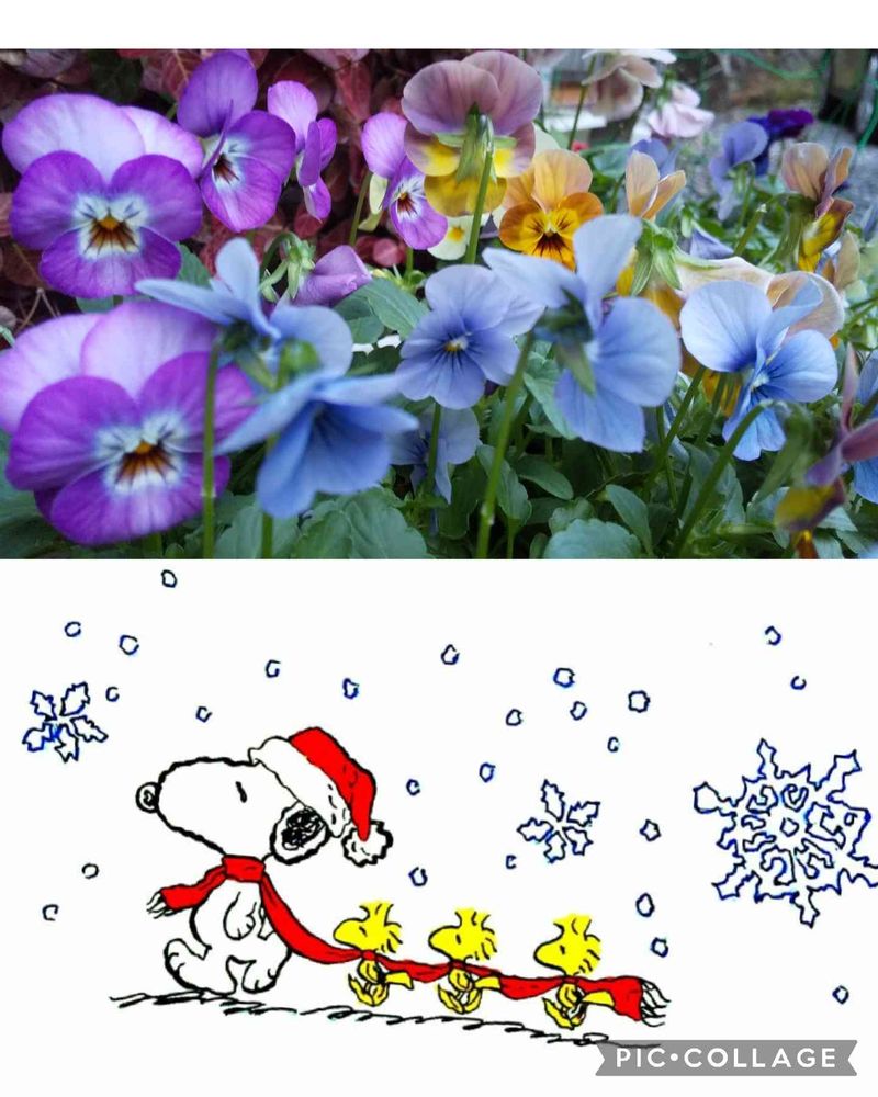 雪❄️の中のスヌーピーさんと凛と咲くビオラのコラボ、素敵です✨✨✨