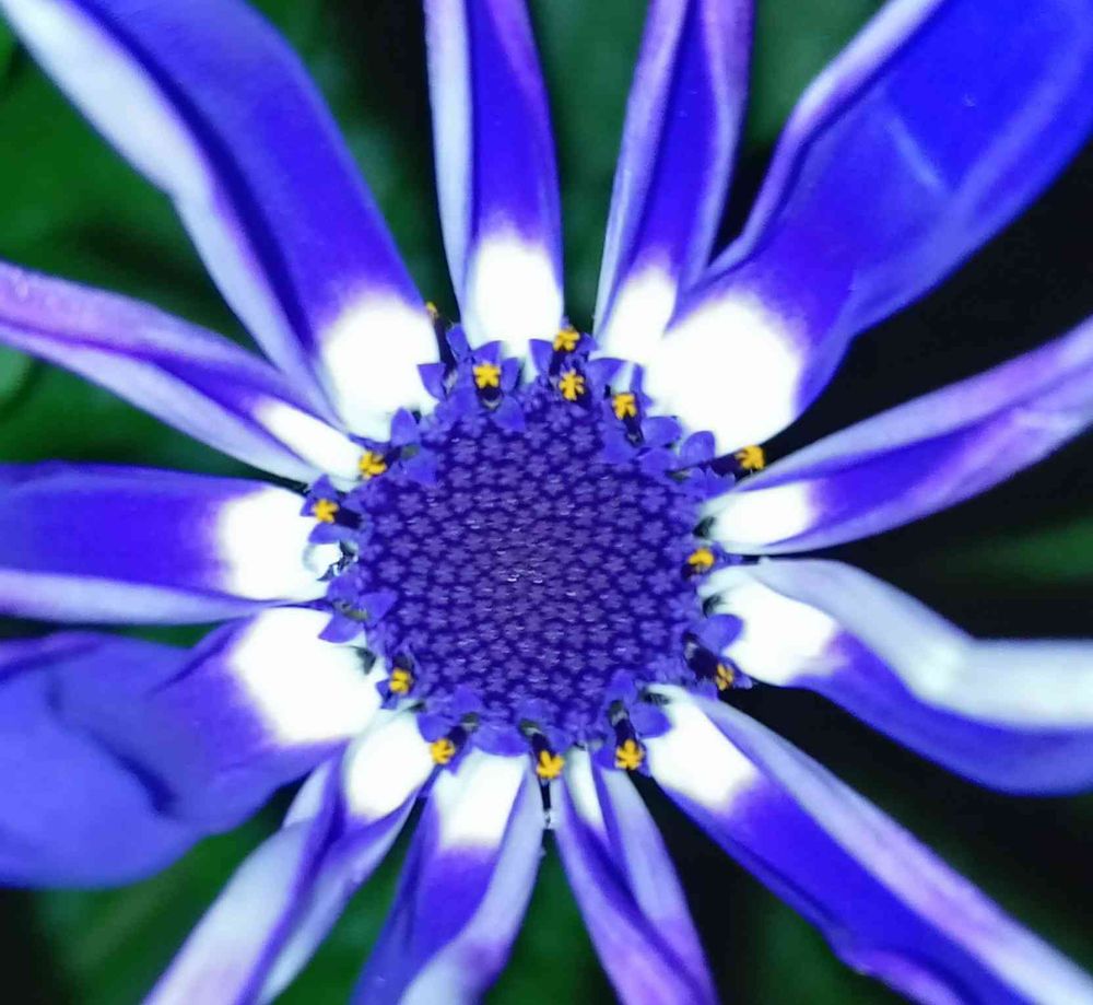 青いシベの外側に散りばめられた星が輝くみたいな黄色いシベ。