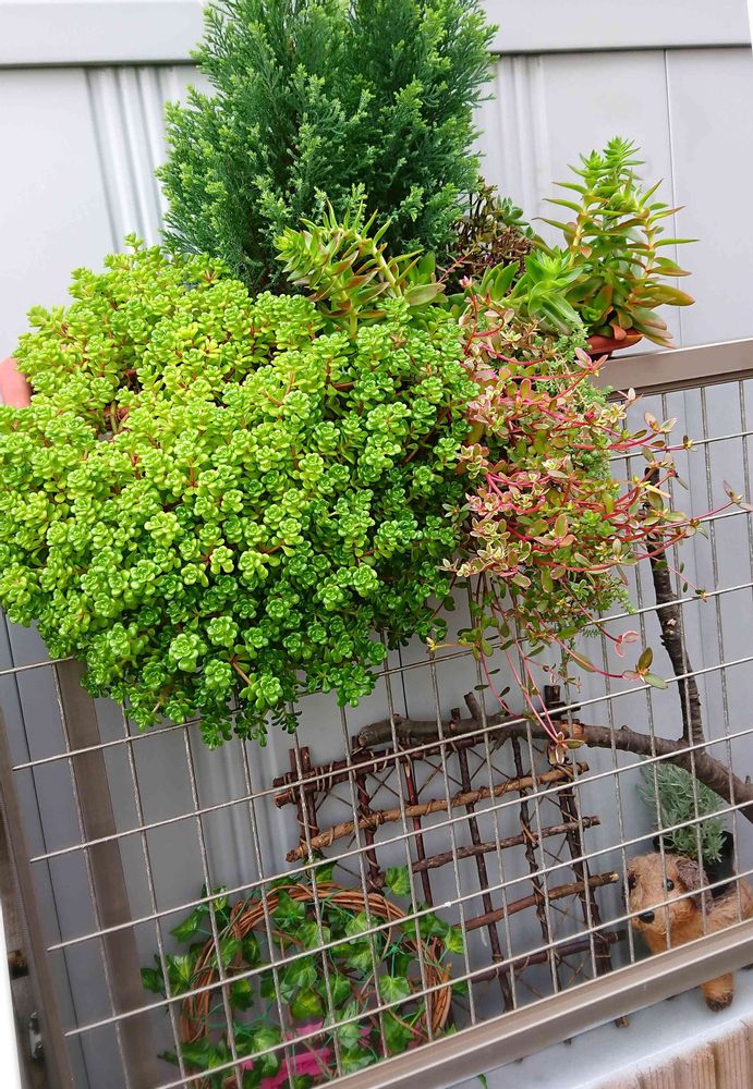 玄関の門の上でモリモリになった浜万年草さんの鉢を、真横のフェンスにお引っ越ししました😅