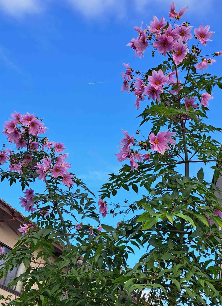 背高のっぽの皇帝ダリアさんは、どうしても見上げる写真になるので、青空バックが良いですね〜💕