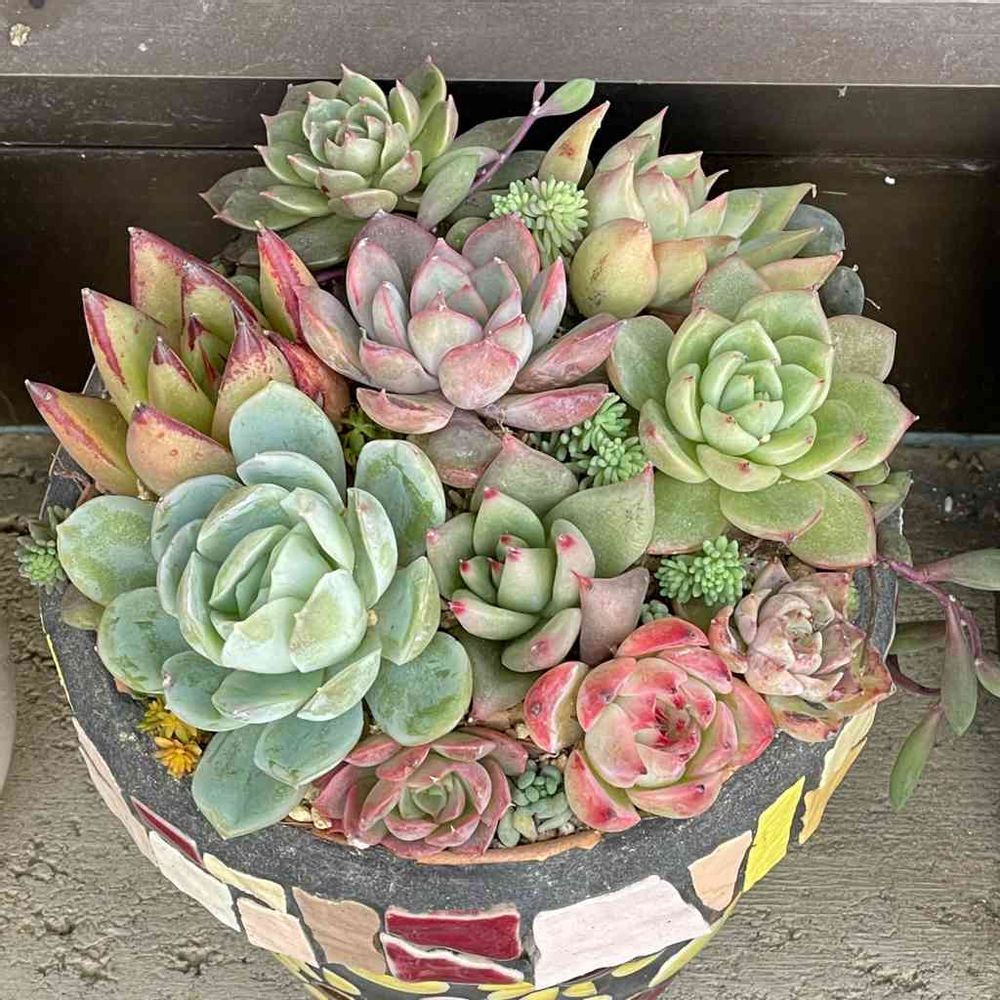 先週の日曜日に、タニ友さんのタイル鉢に、おまけでいただいた子などを集めて寄せ植えしました🤗セダムで隙間を穴埋め😁
