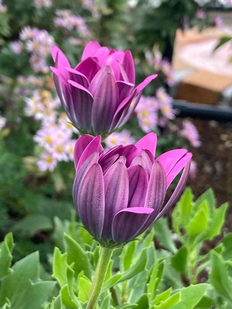ケーキ屋さんの花壇に開きかけた綺麗な色のオステオスペルマム💖