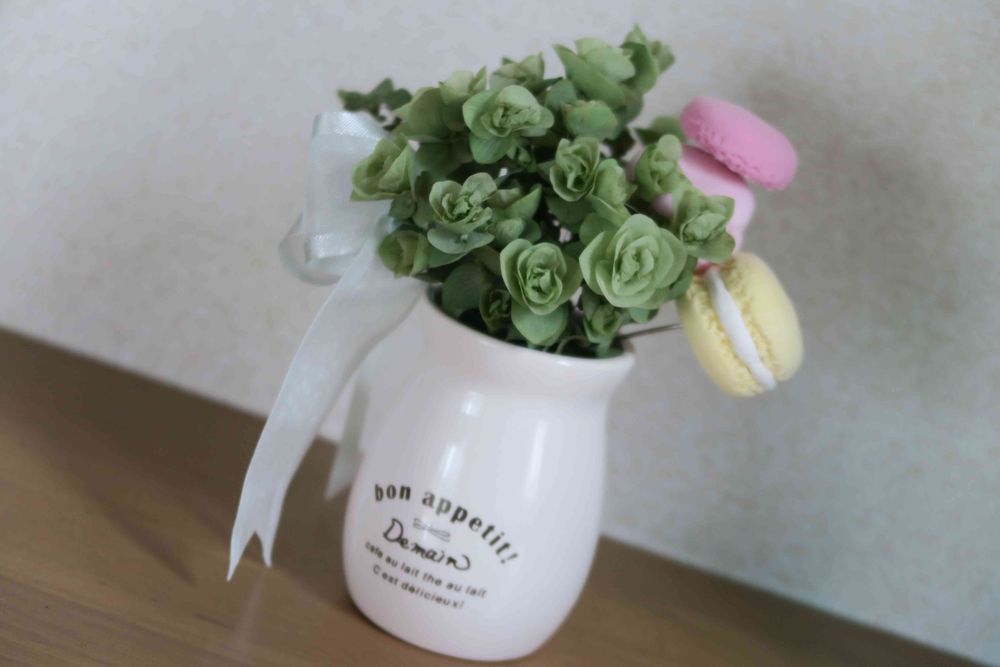オレガノケントビュ-ティ-のドライを使って、アレンジしてみました。手作りのマカロンとリボンを添えてみました♪