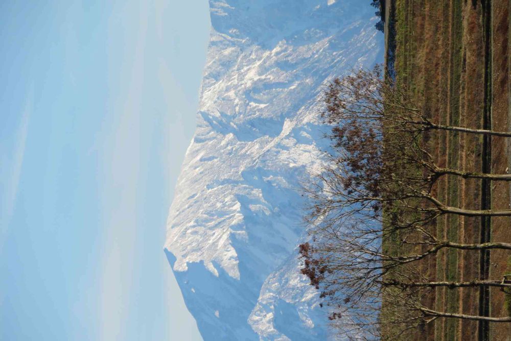 キーンと冷たい空気の中に、ハザ木と越後三山の背景が見事です!