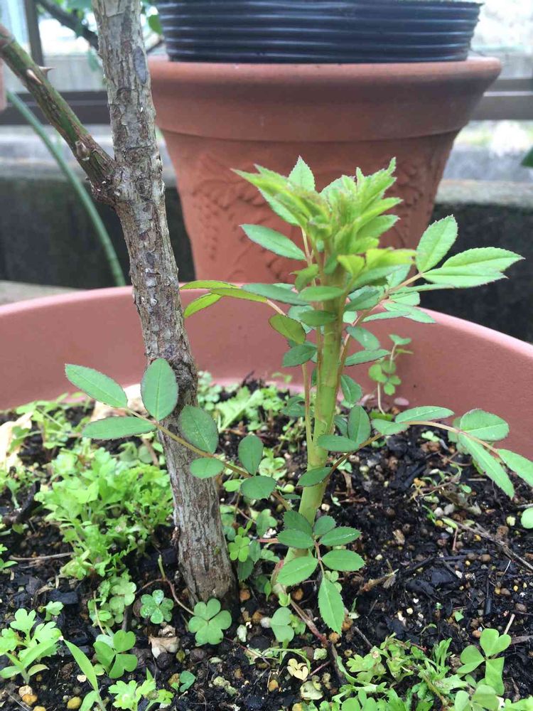 バラの根元から、元気なベイサルシュートが出たのかと喜んで