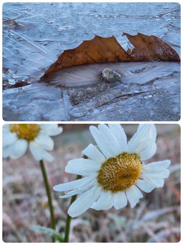 霜がふったんですね。水溜まりの氷、草の上のザクザク。