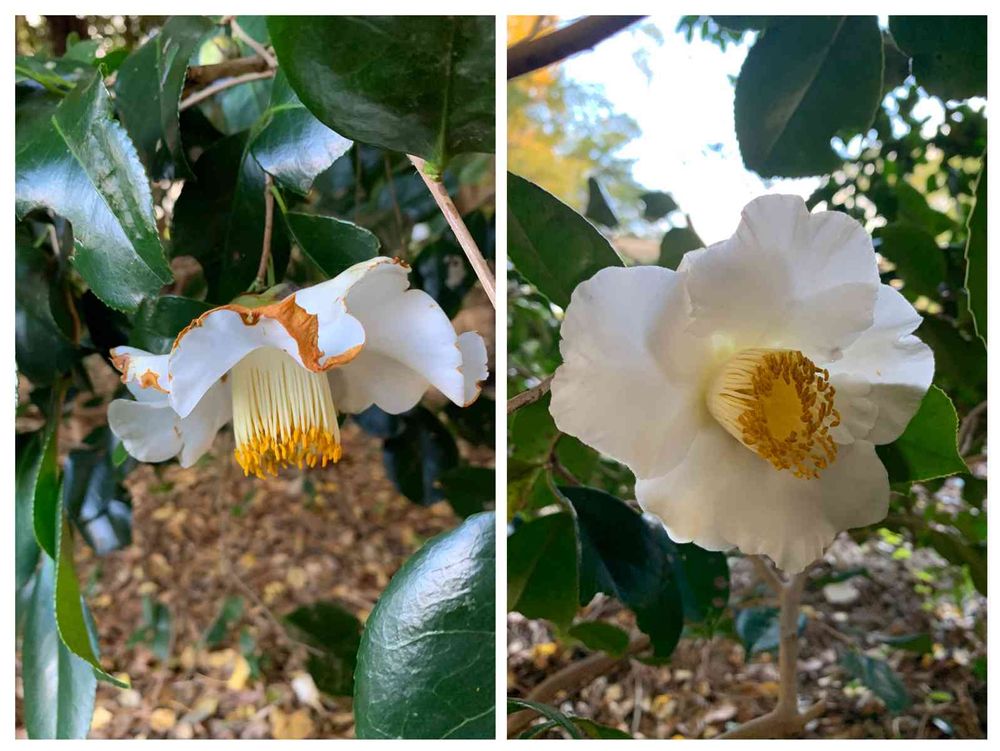 花びらにフリルがあって、優しい感じの、白椿ですネ〜