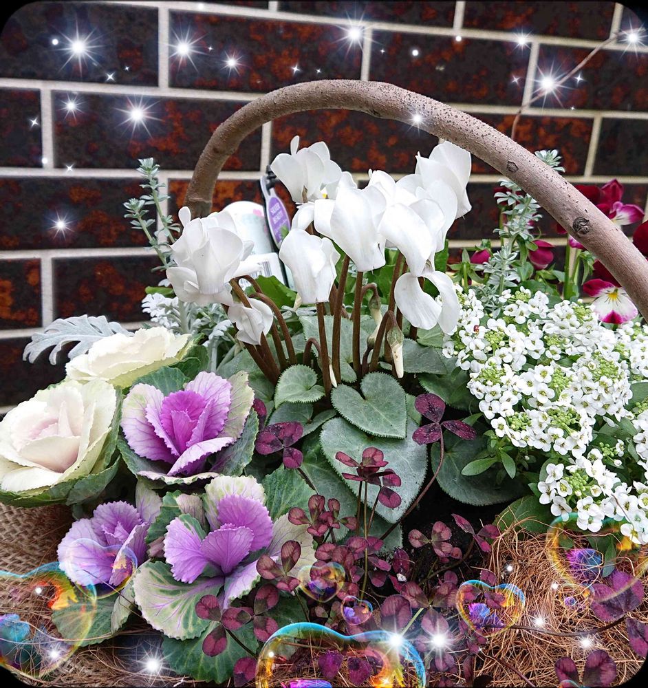真っ白なシクラメンをメインに豪華な寄せ植えですね😍
