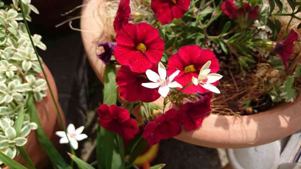 姫檜扇がいい具合に寄り添い咲き。まだ植え替えずミリオンベルの鉢の横に置きっぱなし😅