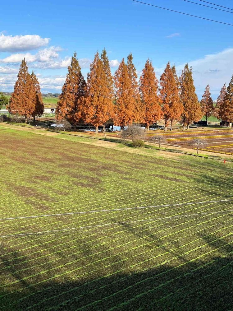 青空とメタセコイアと何かのグリーンの色相がすてきです💕