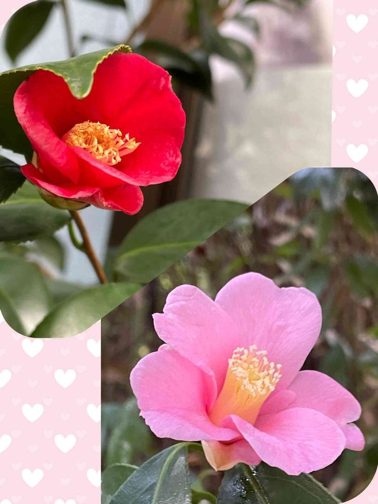 我が家の赤いヤブツバキとウォーキング中に林で見つけたピンクのヤブツバキ