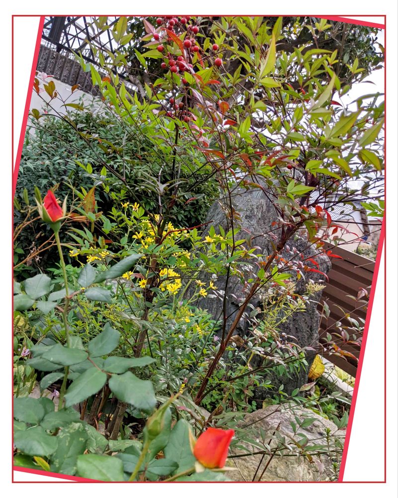 これからの庭仕事はパスの日が多くなりそう🍃🍃バラのプリンセスミチコ様が蕾をつけていました ツワブキと南天の実も…♡ 秋の庭🏡