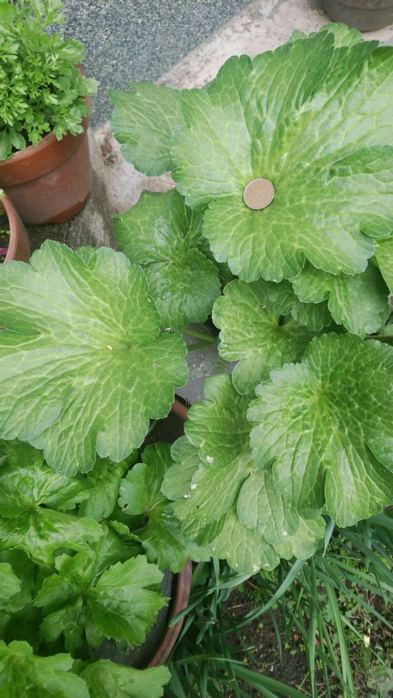 このラナンキュラスラックス「ガラテア」なんですが、葉っぱが超でっかくないですかね?😲💧比較に葉の上に十円玉を置いてみました となりにちょこっと見えるのが普通サイズのラックスの葉っぱなんすけど…ラックスそのものは育てて2年目のものですが